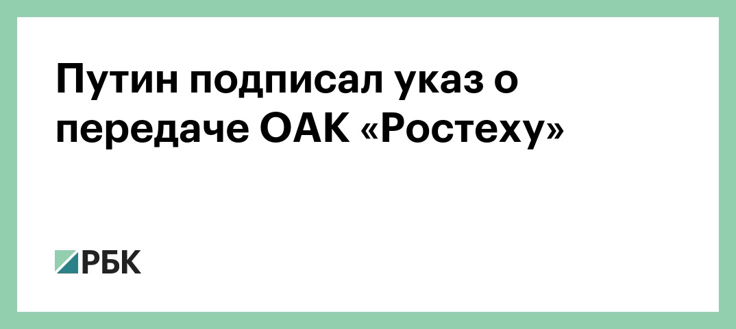 Президент России Владимир Путин передал госкорпорации «Ростех» 92,31% акций «Объединенной авиастроительной корпорации» (ОАК). Соответствующий указ опубликован на портале правовой информации.
