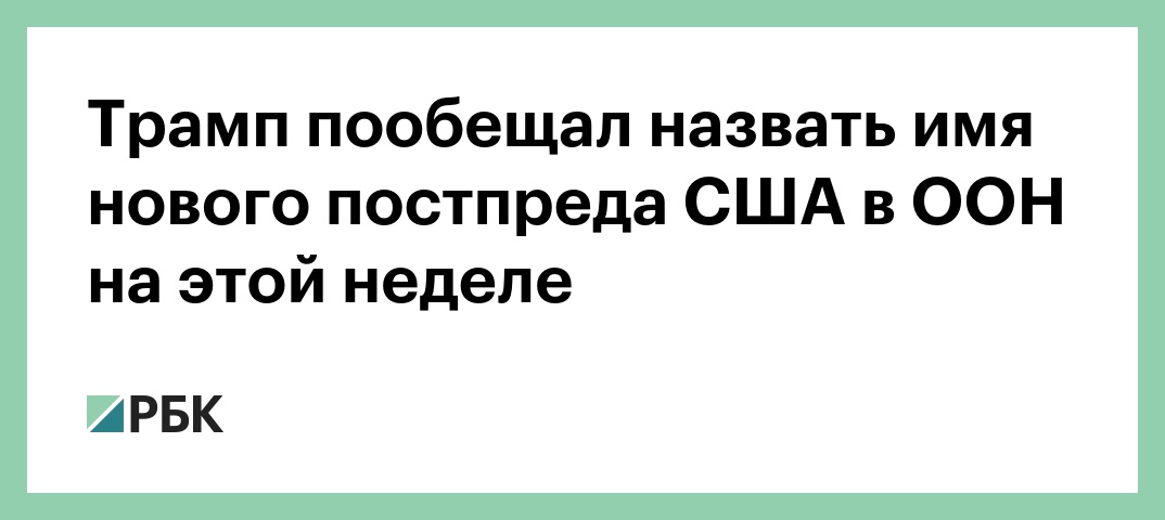 Действующий постоянный представитель страны в ООН Никки Хейли подала в отставку в начале октября. Сообщалось, что среди кандидатов на ее пост рассматриваются бывший заместитель советника президента США по нацбезопасности в вопросах стратегии и экс-советник по экономическим инвестициям Дина Пауэлл, посол США в Канаде Келли Крафт, а также официальный представитель Госдепа Хизер Нойерт.