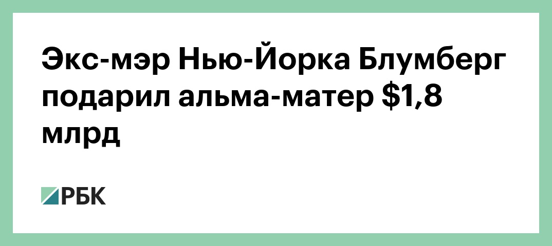 Экс-мэр Нью-Йорка Майкл Блумберг заявил, что жертвует университету Джонса Хопкинса, в котором прошел обучение, $1,8 млрд. Об этом он[ написал](https://twitter.com/MikeBloomberg/status/1064265197156802561) в своем Twitter.