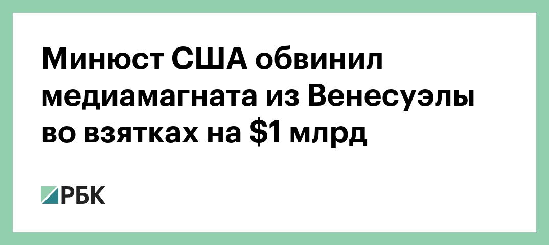 Проживающий в Майами, штат Флорида, 50-летний венесуэльский медиамагнат Рауль Горрин Балисарио, владеющий телеканалом Globovision, обвиняется в отмывании денег и взятках на $1 млрд. Об этом сообщается на сайте Министерства юстиции США. Обвинения также выдвинуты против двух резидентов США — 54-летнего Алехандро Андраде, бывшего венесуэльского казначея и 50-летнего экс-владельца Banco Peravia в Доминиканской Республике Габриэля Хименеса.