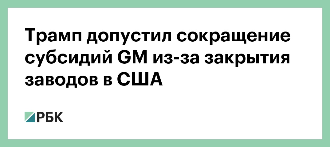 Президент США Дональд Трамп пригрозил сократить госсубсидии для автоконцерна General Motors из-за закрытия части производства в США. Об этом Трамп написал на своей странице в Twitter. Сокращение субсидий США для GM коснется, в том числе, производства электромобилей.