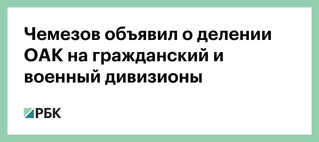 В Объединенной авиастроительной корпорации (ОАК), которая входит в «Ростех», будут созданы два дивизиона, один займется военной техникой, другой — гражданской, сказал глава «Ростеха» Сергей Чемезов на выставке военной техники IDEX-2019, передает корреспондент РБК. Как пояснил Чемезов, это делается в том числе для того, чтобы подразделения, занимающиеся гражданской техникой, не попадали под зарубежные санкции.