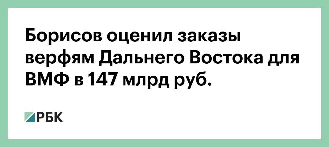 «Судостроительные предприятия Приморского края имеют портфель заказов на строительство кораблей и судов для Военно-Морского флота на общую сумму более 30 млрд руб.», — сказал Борисов. Он добавил, что речь в частности идет о строительстве перспективных малых ракетных кораблей «Каракурт», пограничных сторожевых кораблей «Светлячок» и противодиверсионных катеров «Грачонок».