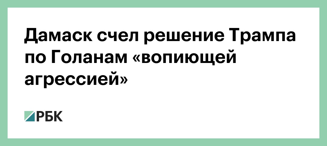 Решение президента США Дональда Трампа признать Голанские высоты территорией Израиля — «вопиющая агрессия» в отношении суверенитета Сирии. Такую позицию выразил МИД Сирии, пишут местное агентство SANA и [Associated Press.](https://www.apnews.com/ba84fb6eff50401da2e4404df73414ee)