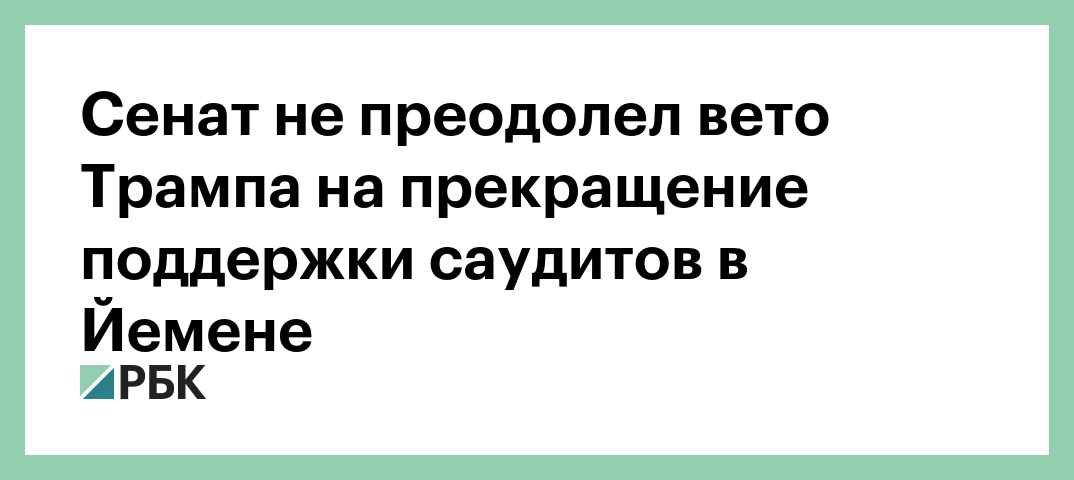 В середине марта сенат проголосовал за резолюцию, согласно которой вмешательство США в гражданскую войну в Йемене и поддержка саудитов может произойти только при согласовании с конгрессом. Трамп наложил вето на это решение и в том числе отметил, что документ «ставит под угрозу жизнь американских граждан».