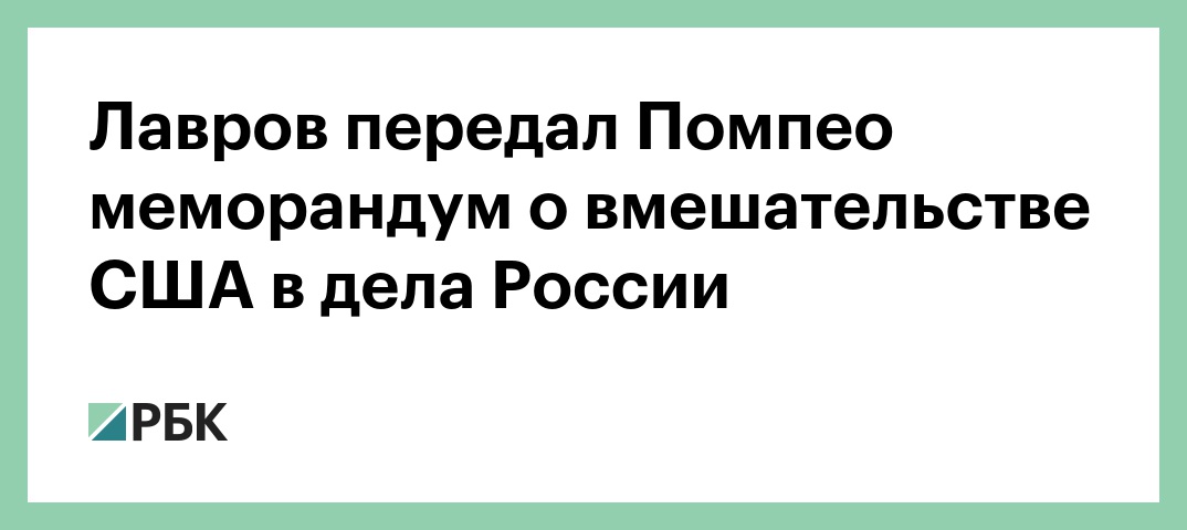Министр иностранных дел Сергей Лавров по итогам переговоров в Сочи с госсекретарем США Майком Помпео сообщил, что передал коллеге «неофициальный меморандум» с доказательствами вмешательства Соединенных Штатов во внутренние дела России. Об этом сообщает корреспондент РБК.