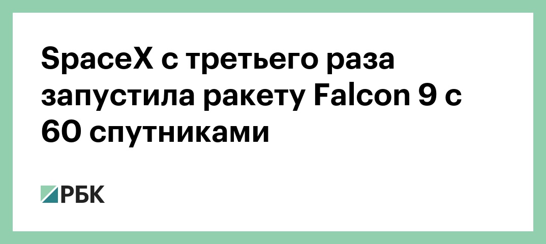 Американский производитель космической техники SpaceX с третьей попытки запустил ракету-носитель Falcon 9 с 60 интернет-спутниками проекта Starlink, которые предназначены для создания глобальной сети передачи интернет-трафика. Об этом сообщается в Twitter компании.