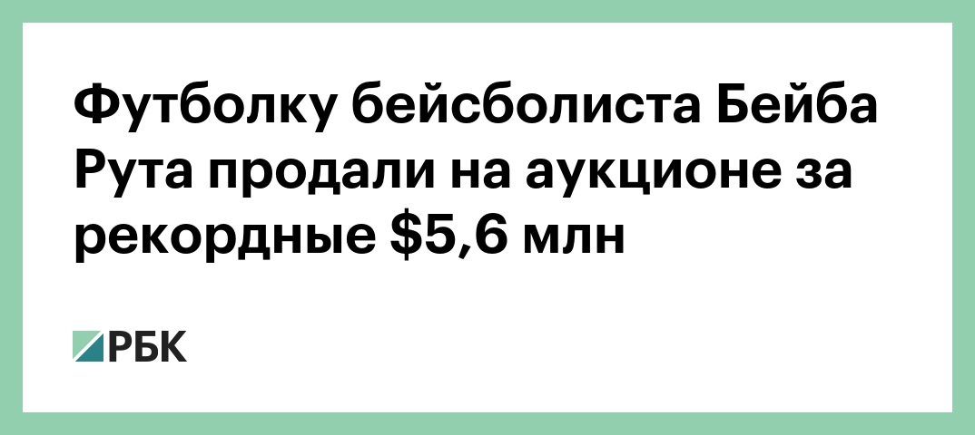 Футболка профессионального американского бейсболиста Бейба Рута была продана за рекордные $5,64 млн на торгах Hunt Auctions в Нью-Йорке. Об этом говорится в сообщении аукционного дома в Twitter. Имя покупателя не называется.