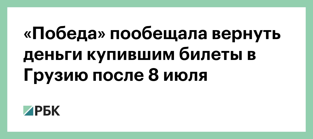 «Победа» в полном размере вернет деньги всем клиентам, купившим билеты на рейсы в Грузию после 8 июля. Об этом РБК сообщили в пресс-службе авиакомпании.