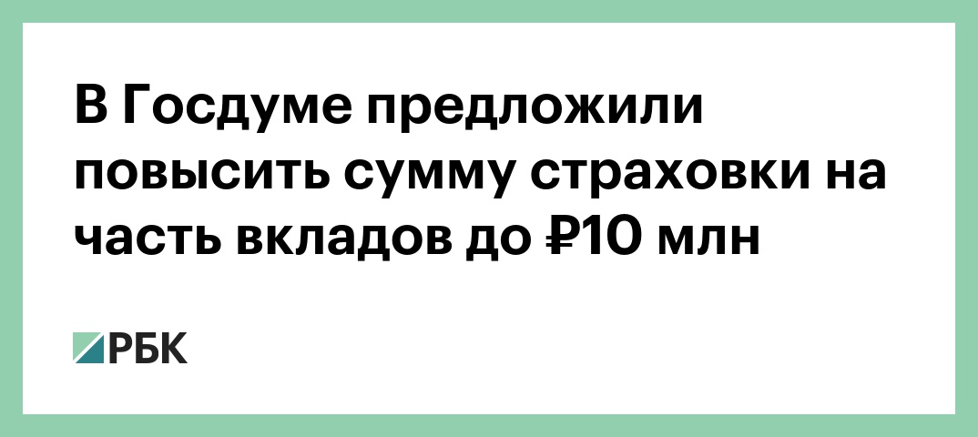 Группа депутатов Госдумы внесла в парламент проект закона о повышении максимального размера страховки по вкладам с нынешних 1,4 млн до 10 млн руб. Столь резко повысить размер страховки по вкладам предлагается только при наличии у вкладчика особых обстоятельств, к которым относится поступление денег на счет в результате: