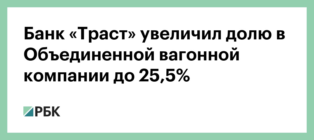 Банк «Траст» нарастил долю в ПАО «Объединенная вагонная компания» с 5,7 до 25,5%. Об этом говорится в материалах банка. Количество голосов при этом увеличилось с 6,6 млн до 29,6 млн.
