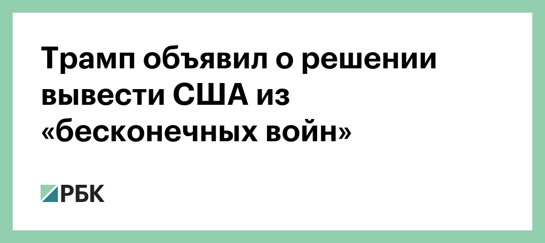 «США должны были находиться в Сирии 30 дней, это было много лет назад. Мы остались и погружались глубже в бой без цели. Пришло время выйти из этих нелепых бесконечных войн и вернуть наших солдат домой», — написал он. Трамп заявил, что за время его президентства Соединенные Штаты «на 100% разгромили халифат «Исламского государства» (террористическая группировка, запрещенная в России. — РБК)». США, по его словам, готовы «снова разгромить ИГ», если боевики будут представлять опасность, добавил американский лидер.
