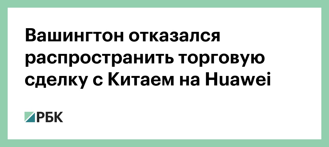 Китайская телекоммуникационная корпорация Huawei не является частью торгового соглашения между США и КНР. Об этом заявил торговый представитель США Роберт Лайтхайзер. «В этом соглашении мы не затрагиваем конкретно Huawei, он не являются частью договора. Это отдельный процесс», — сказал он, передает The New York Times.