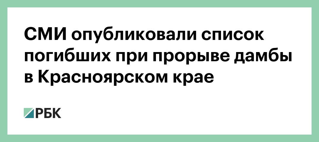 Telergam-канал Mash, портал «Лайф» и «Комсомольская правда» опубликовали список погибших при прорыве дамбы в Красноярском крае. В настоящее время известно о 15 жертвах и 14 пострадавших. Есть и пропавшие без вести.