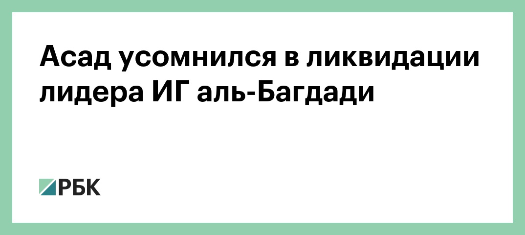 Сообщениям о ликвидации главаря запрещенной в России террористической организации «Исламское государство» (ИГ) Абу Бакра аль-Багдади нельзя верить, пока не будут предоставлены доказательства. Об этом заявил президент Сирии Башар Асад в интервью сирийским телеканалам, передает SANA.