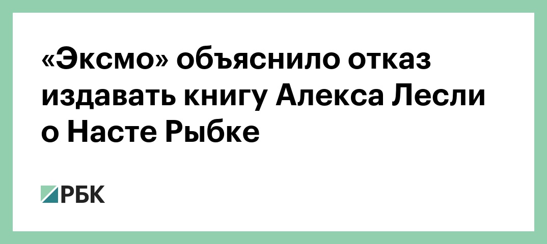 Издательство «Эксмо» отказалось издавать книгу Александра Кириллова (Алекса Лесли) «Go to fish» про Настю Рыбку и вернуло ему права. Об этом РБК сообщил гендиректор издательства Евгений Капьев. Ранее об отказе издавать книгу изданию Baza заявил Лесли.