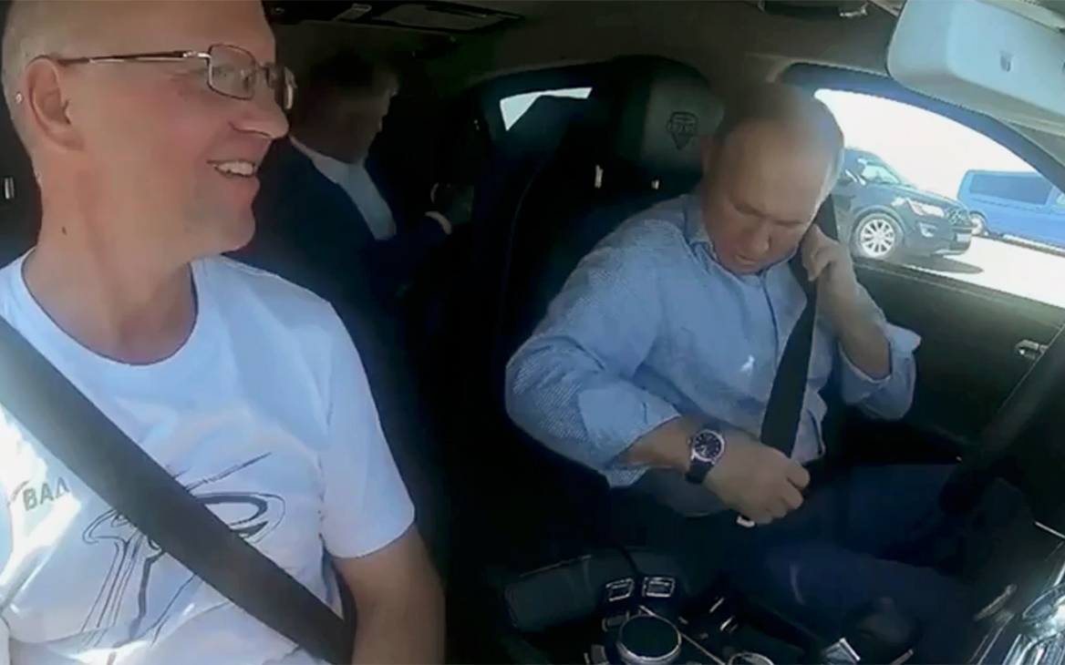 Первым делом, садясь за руль, Путин пристегнул ремень безопасности. «Надо пристегнуться, а то потом штраф придется платить», — сказал президент.