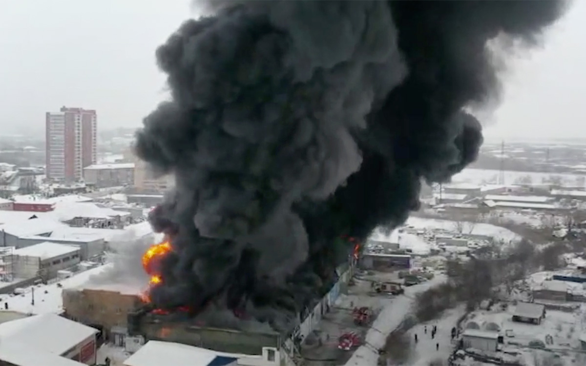 Утром в Красноярске загорелся склад автозапчастей, из-за пожара на складе обрушилась крыша. Один человек погиб, также утеряна связь с тремя тушившими огонь пожарными
