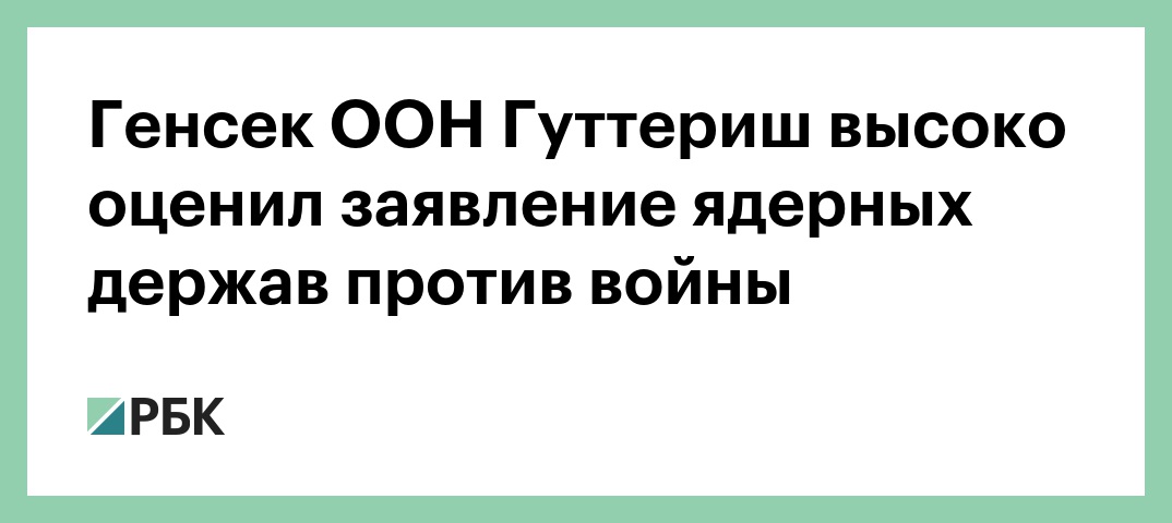 Генеральный секретарь ООН Антониу Гуттериш приветствует заявление стран «ядерной пятерки» против развязывания войны с использованием ядерного оружия, сообщил его пресс-секретарь Стефан Дюжаррик. Заявление опубликовано на сайте организации.