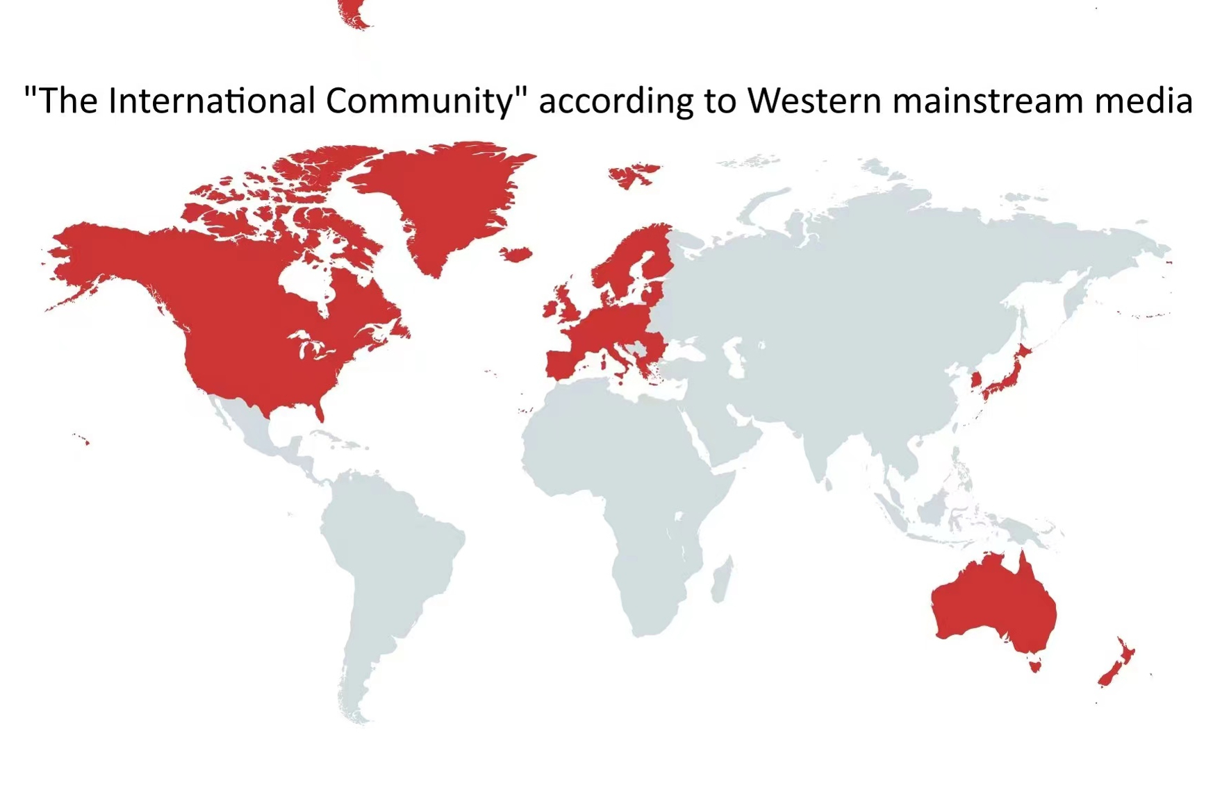 Фотографии опубликованы под заголовком «Что значит «международное сообщество»?» На первой изображена карта мира, на которой темно-красным цветом закрашены все страны. На второй — тем же цветом, но только страны Европы, Австралия, Новая Зеландия, Япония, Южная Корея, США и Канада.