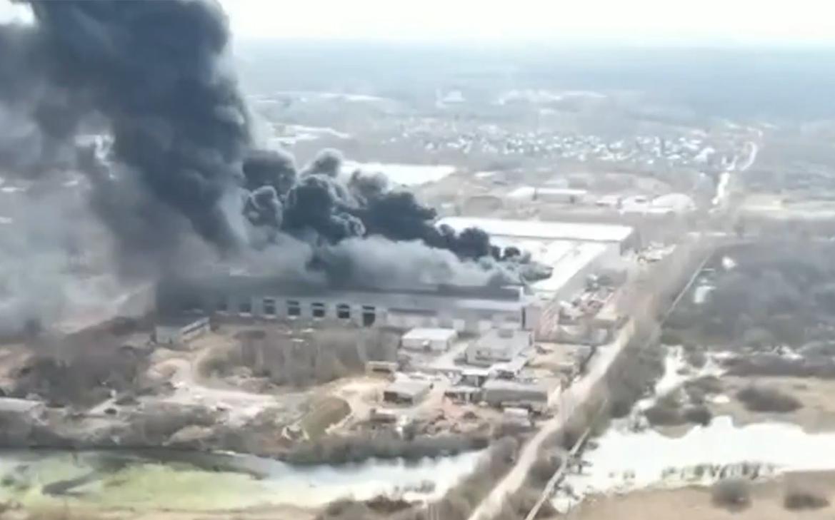 Как выглядит пожар цеха деревообработки в Вологде с дрона. Видео