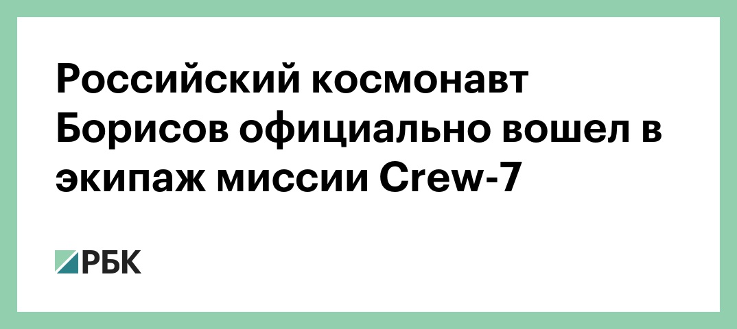 «Космонавт «Роскосмоса» Константин Борисов полетит в составе седьмой ротационной миссии SpaceX к орбитальной лаборатории NASA», — говорится в сообщении управления. Это будет первый космический полет для Борисова, который вошел в отряд космонавтов «Роскосмоса» в качестве кандидата в космонавты-испытатели в 2018 году.