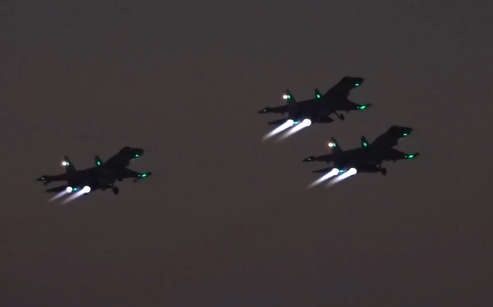 Минобороны опубликовало новые кадры полета истребителей Су-35, которые сопровождали борт Владимира Путина во время визита в ОАЭ и Саудовскую Аравию. На кадрах видно, как самолеты взлетают с аэродрома и выполняют полет.