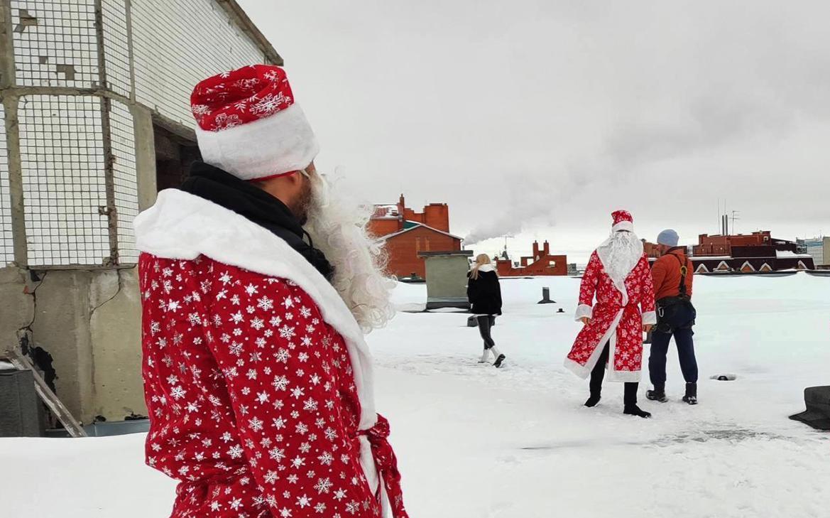 Деды Морозы спустились с крыши и постучались в окна отделений стационара. Они пожелали детям скорейшего выздоровления и подарили сладкие подарки.