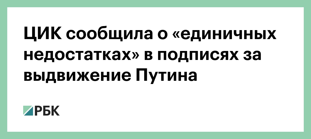«Подписи, предъявленные представителями избирательного штаба Владимира Владимировича, отличались очень высоким качеством, и выявлены буквально единичные недостатки, которые мы предъявили в протоколе, а именно по нескольким десяткам подписей, что позволяет рассмотреть вопрос о регистрации», — сказал Булаев.