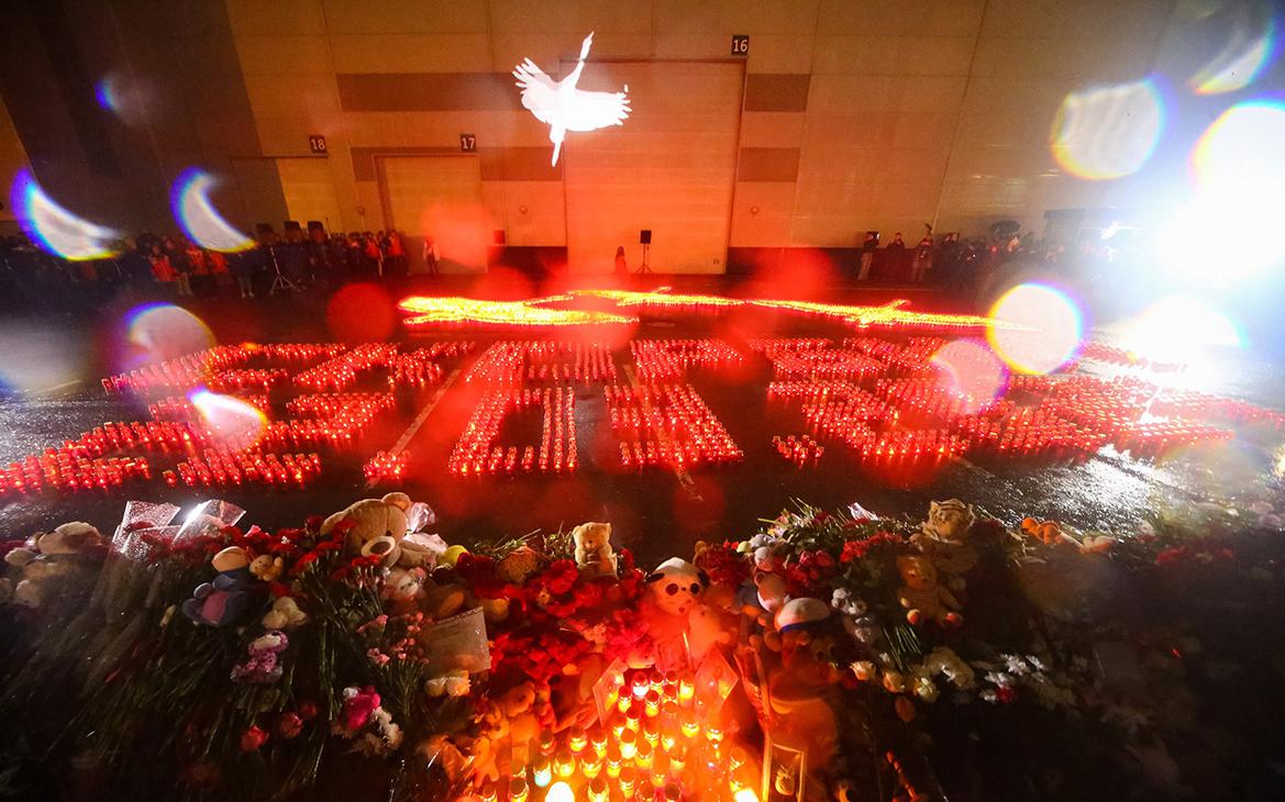 У «Крокус Сити Холла» прошла акция памяти, во время которой на стену торгового комплекса на улице проецировалось изображение улетающих в небо журавлей. На земле из свечей собрали изображение журавлей, а под ними — надпись «скорбим».