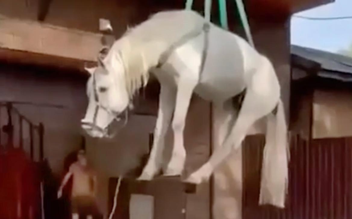 Под Оренбургом спасенную от паводка лошадь спустили с балкона с помощью крана