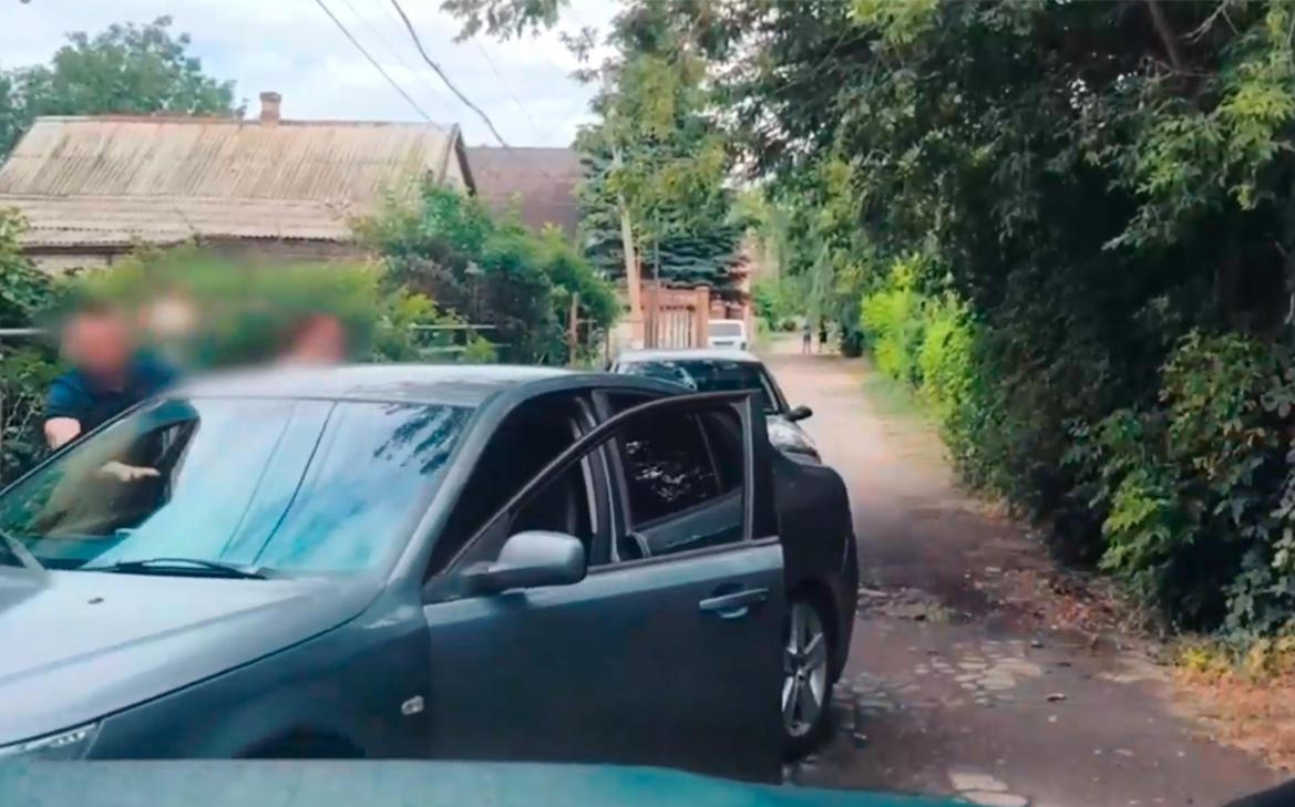 На опубликованных кадрах задержания видно, как сотрудники ФСБ вытаскивают из автомобиля мужчину и его спутницу и укладывают подозреваемого на землю.