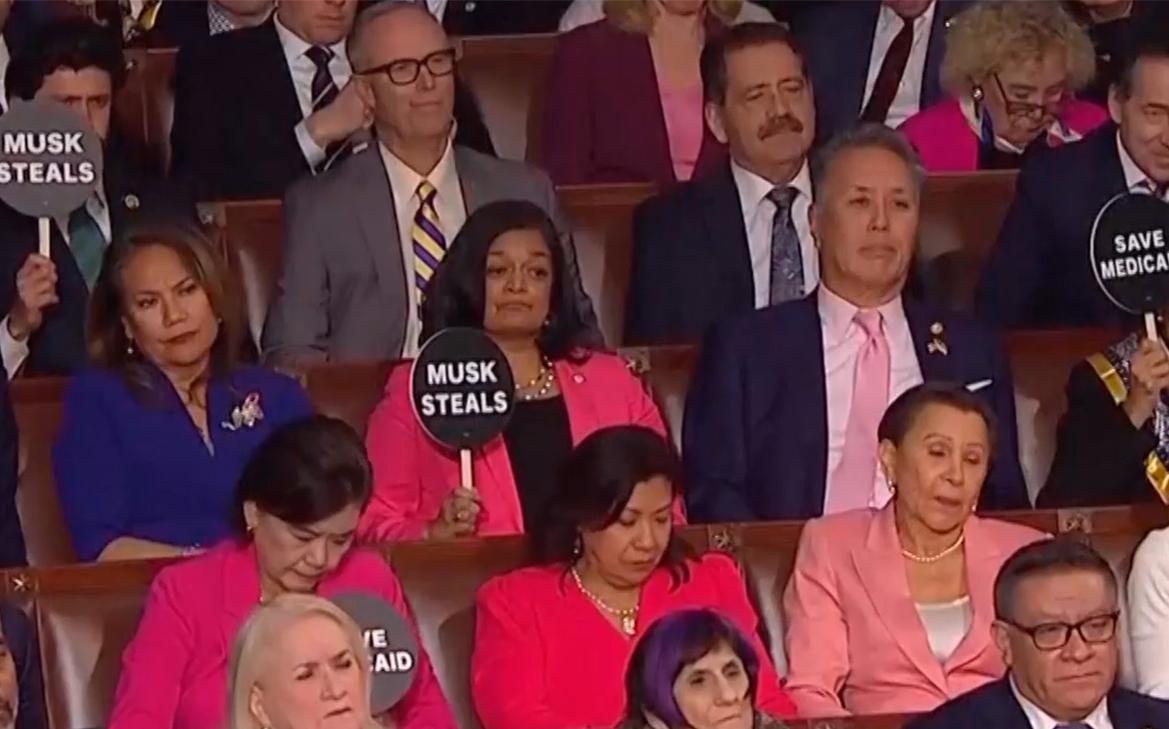 Демократы мешают республиканцу выступать, выкрикивая лозунги и размахивая табличками «спасите Medicaid» (американская программа финансирования медицинских расходов для малоимущих) и «Маск ворует». Также они поднимали таблички с надписью FALSE на некоторые утверждения Трампа.