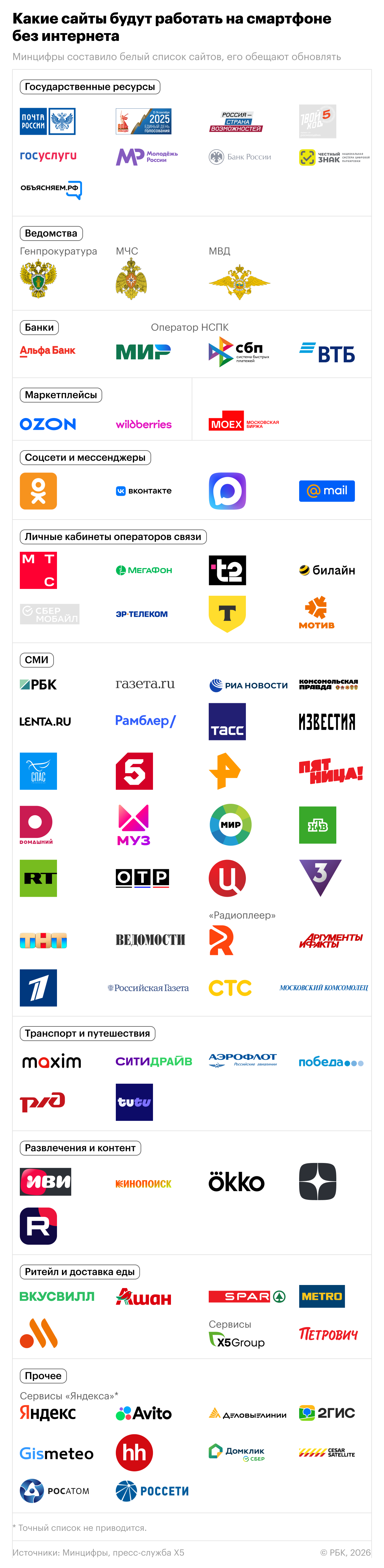 В список, в частности, вошли все государственные сайты и сервис «Госуслуги», сервисы «Яндекса», соцсети «ВКонтакте» и «Одноклассники», а также сервисы ряда банков, включая Сбербанк, Альфа-банк и Т-банк.\