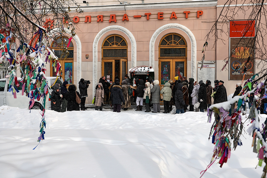 Екатеринбург. Люди несут цветы к «Коляду-театру», где проходит прощание с драматургом Николаем Колядой.
