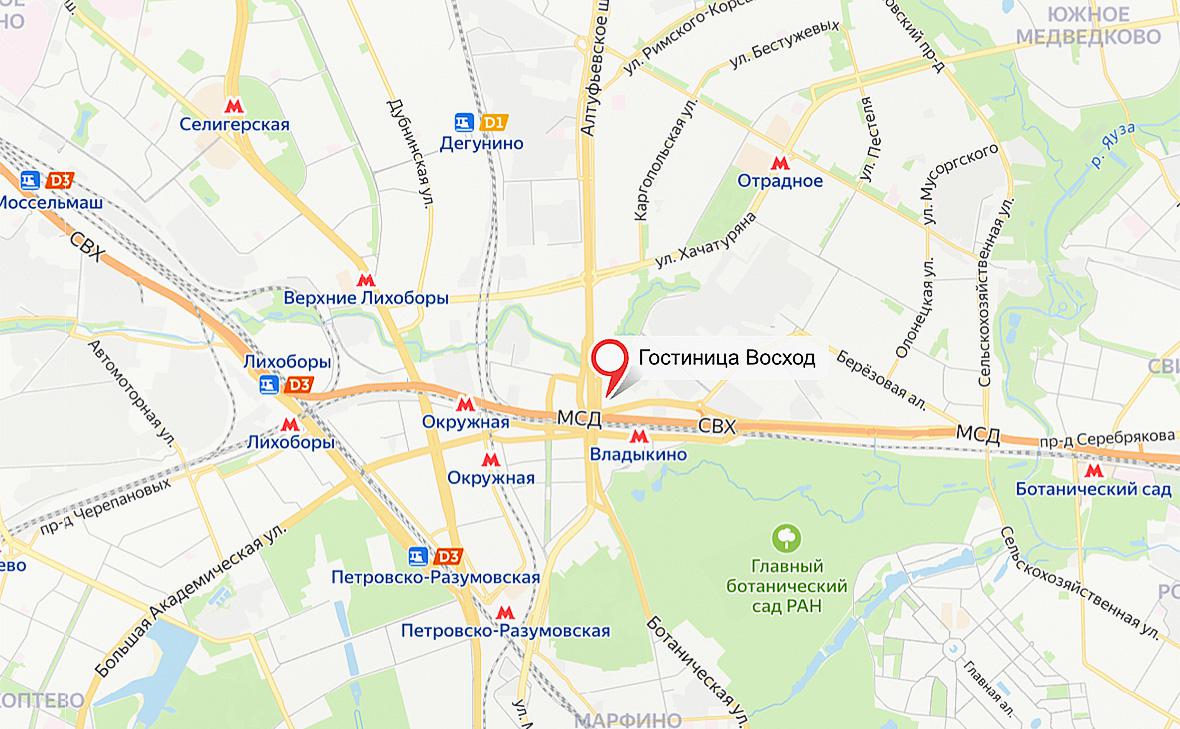 В дежурную часть поступило сообщение о возгорании в административном здании по адресу: Алтуфьевское шоссе, дом 2. Судя по «Яндекс Картам», в здании находится в том числе гостиница «Восход». Пожар произошел на втором этаже здания.