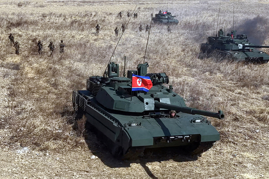 Ким Чен Ын наблюдал за маневрами пехоты, танковых подразделений и спецназа по совместному наступлению, а на снимках он и его дочь видны на танке с установленным государственным флагом КНДР.