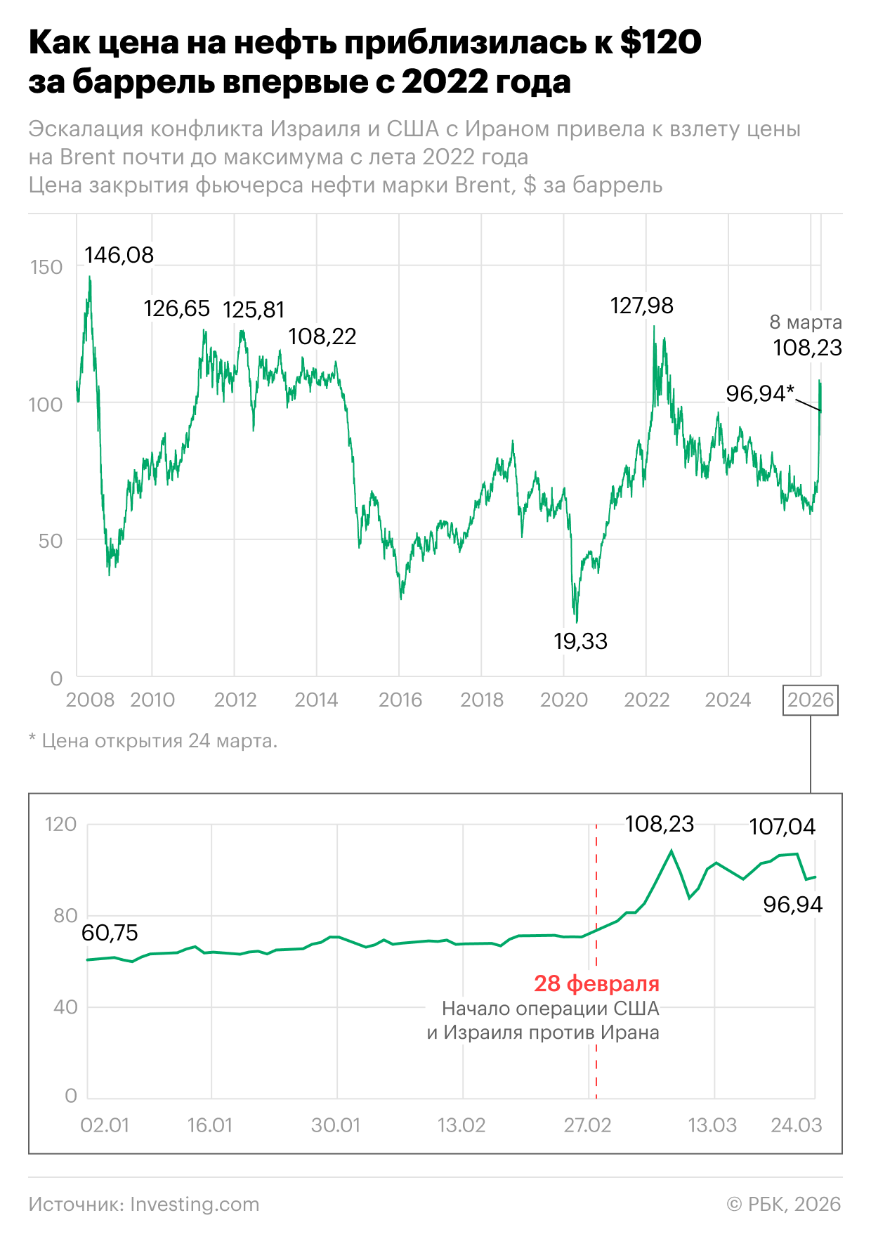 После начала конфликта США и Ирана, а также блокады Ормузского пролива цены на энергоресурсы по всему миру выросли. Если цена фьючерсов на нефть марки Brent 25 февраля составляла около $70 за баррель, то 25 марта стоимость достигла $96 за баррель.