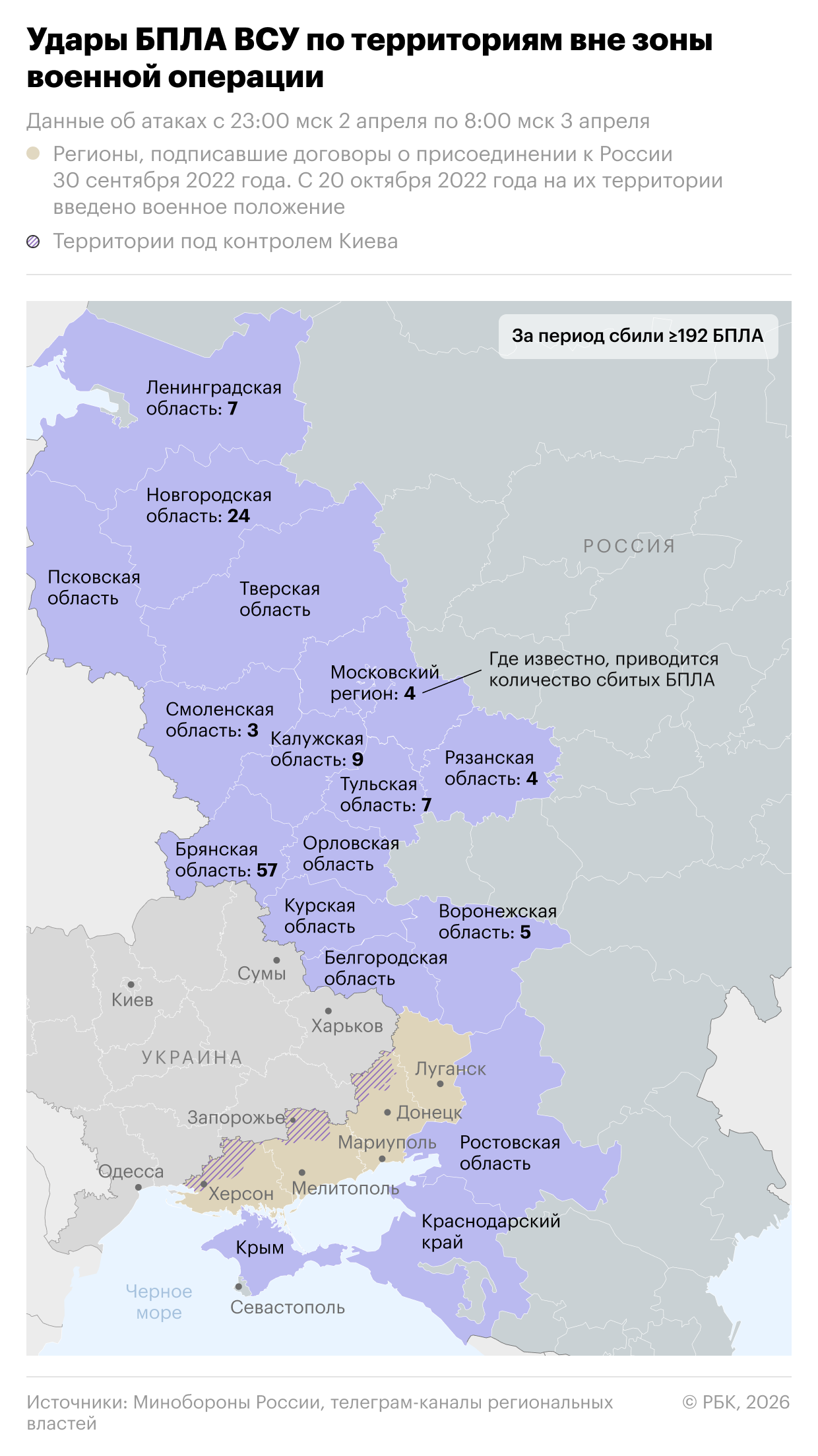 Днем 2 апреля Минобороны сообщило, что дежурные средства ПВО перехватили и уничтожили 49 беспилотников над регионами России.