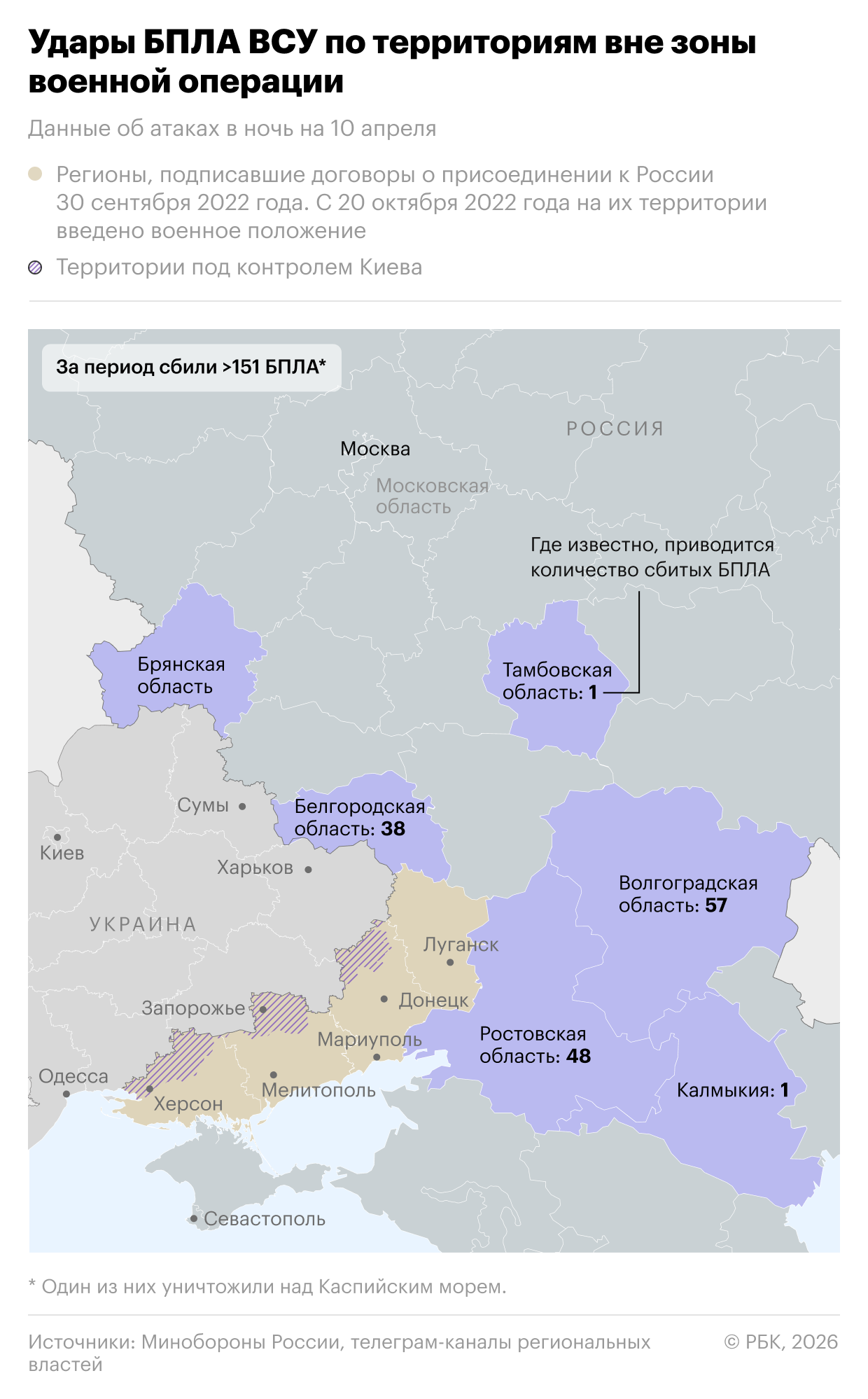 Подразделения ПВО за ночь 9 апреля сбили над Россией 69 беспилотников. Аппараты уничтожили в небе над Курской, Астраханской областями, Краснодарским краем, а также над акваторией Азовского моря.