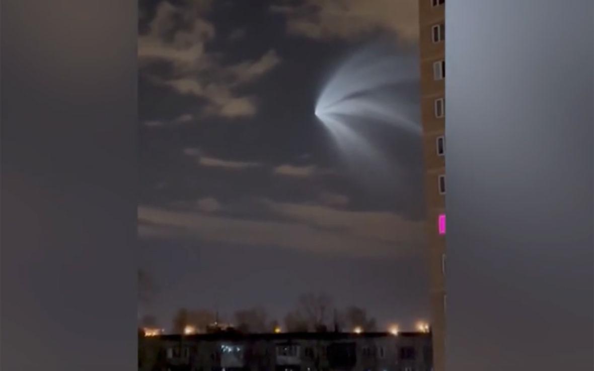 На кадрах виден многоквартирный жилой дом на фоне ночного неба. Между облаков движется белый световой луч с распростертыми в разные стороны концами.