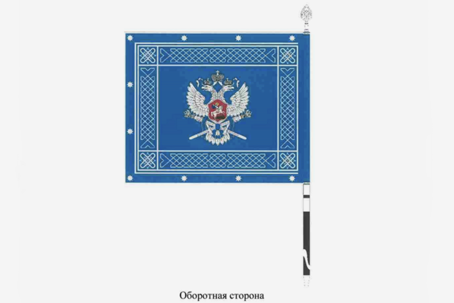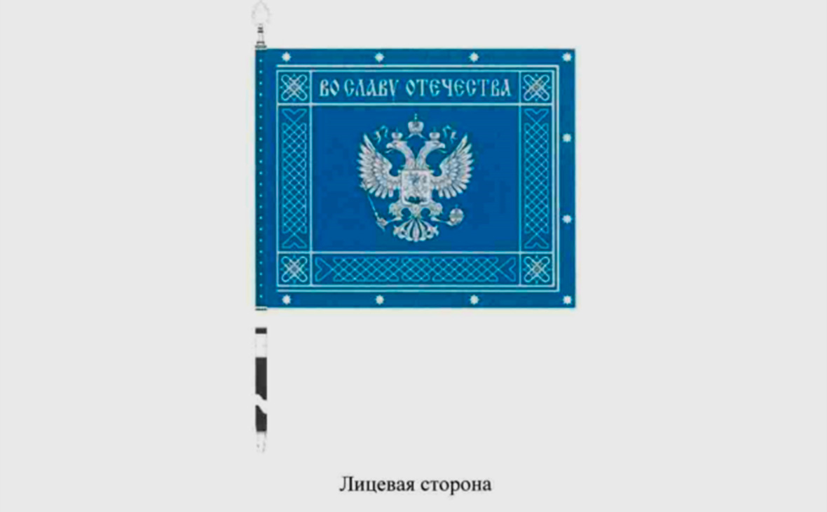 На знамени синего цвета находится одноцветное серебристое изображение фигуры двуглавого орла, поднявшего распушенные крылья, в верхней части рамки есть надпись «ВО СЛАВУ ОТЕЧЕСТВА».