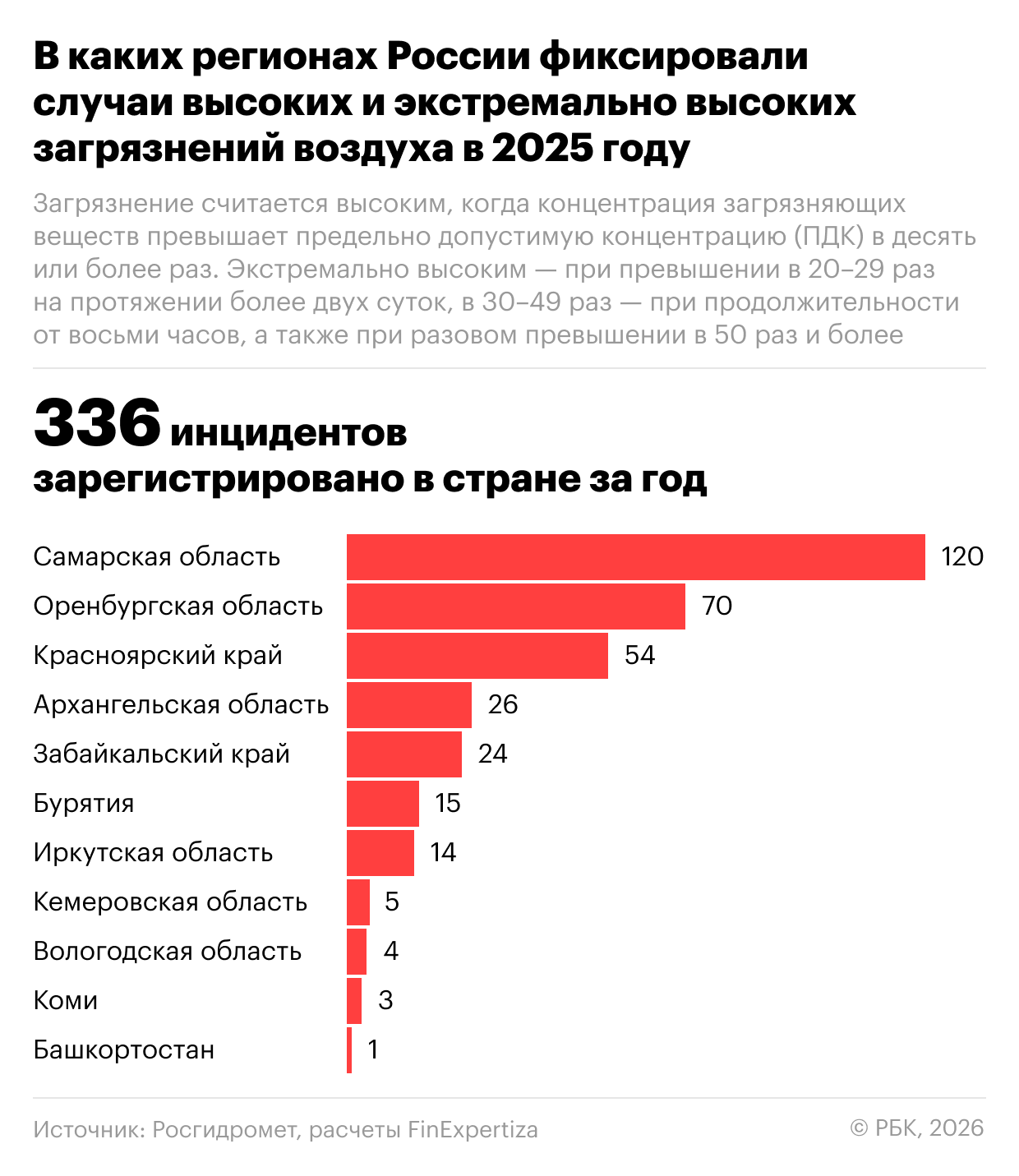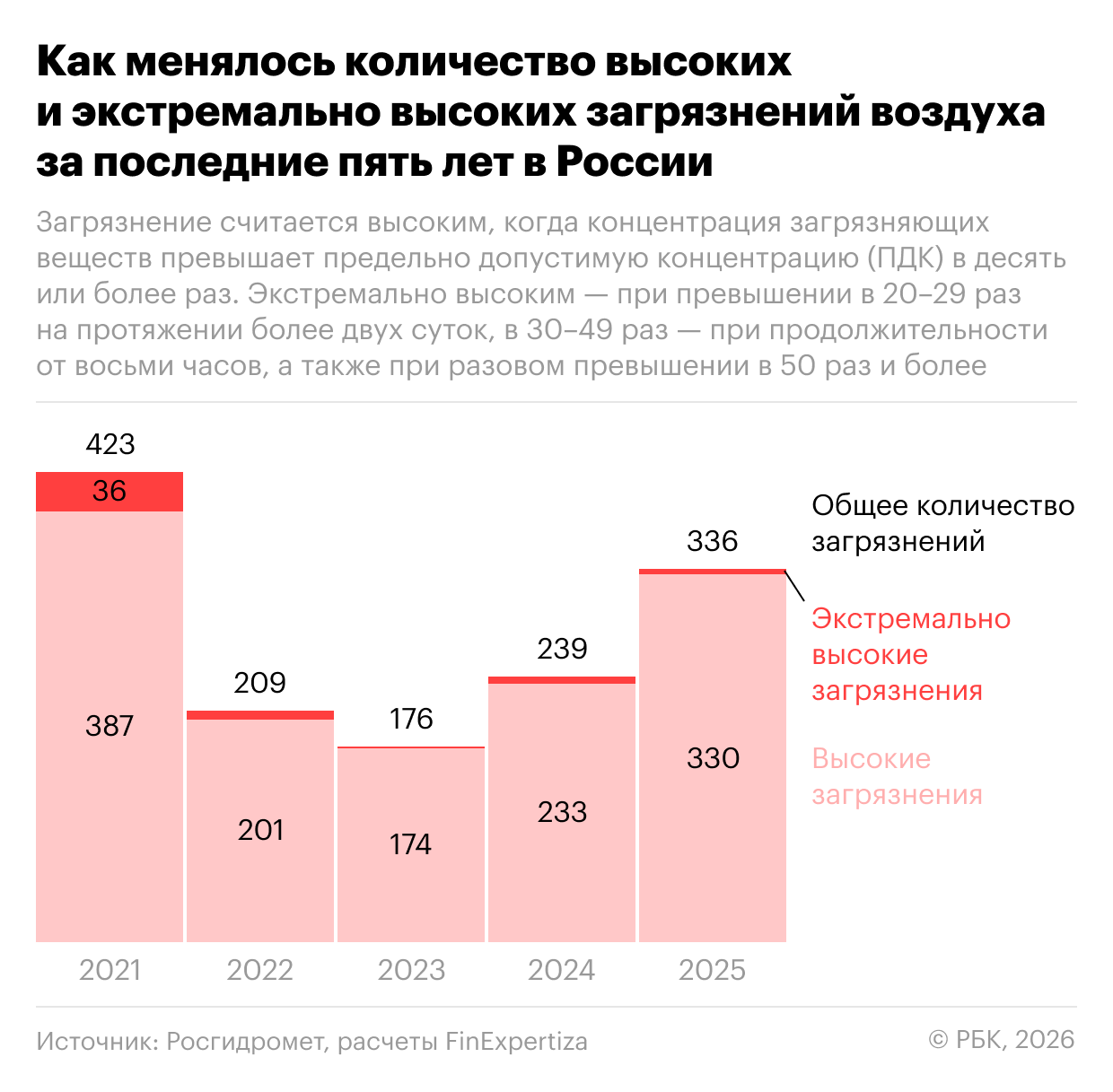 В прошлом году количество зафиксированных в России случаев высокого и экстремально высокого загрязнения атмосферного воздуха увеличилось на 41% по сравнению с 2024 годом, гласит отчет аудиторско‑консалтинговой сети FinExpertiza (есть у РБК), составленный на основе данных Росгидромета. За год было зарегистрировано 336 инцидентов, количество случаев высоких загрязнений выросло на 97.