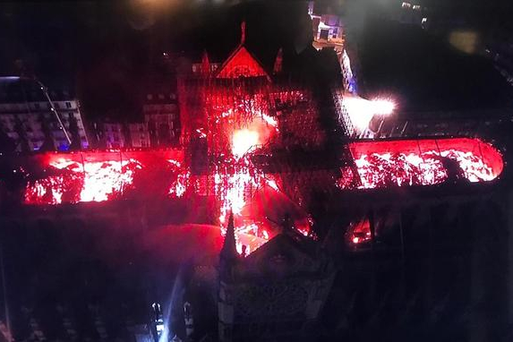 Пожар в соборе Парижской Богоматери начался вечером 15 апреля. В результате происшествия пострадал один пожарный, который получил тяжелые ранения. Реликвии Нотр-Дама, по информации его представителей, удалось спасти. От огня также спасены основные конструкции здания. Тем не менее обрушилось две трети крыши, упал шпиль.