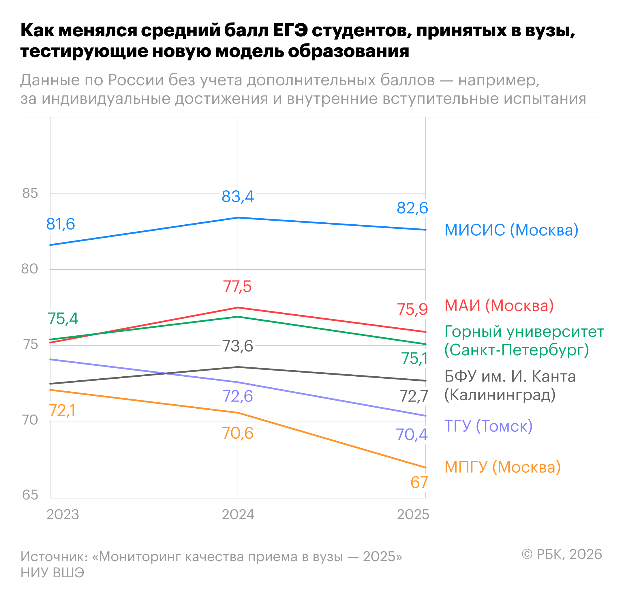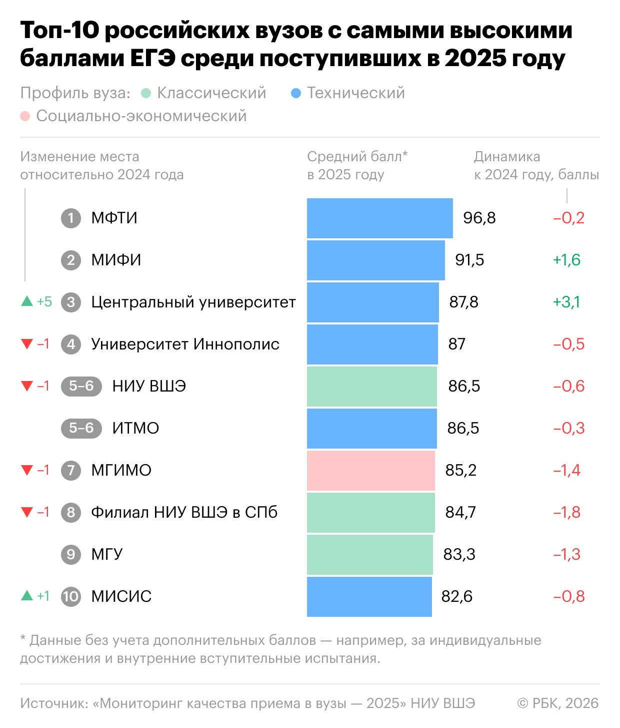 В 2025 году 16 вузов приняли студентов с общим средним баллом выше 80, среди них — семь технических университетов во главе с МФТИ и МИФИ, пять классических университетов (НИУ ВШЭ, МГУ и Новосибирский университет) и их филиалы, которые также ведут набор на инженерные и IТ-направления, а также два медицинских и два социально-экономических вуза (МГИМО и ВАВТ). По сравнению с 2023-м в группе лидеров сменились три университета, а покинули топ рейтинга вузы преимущественно социально-гуманитарной направленности.