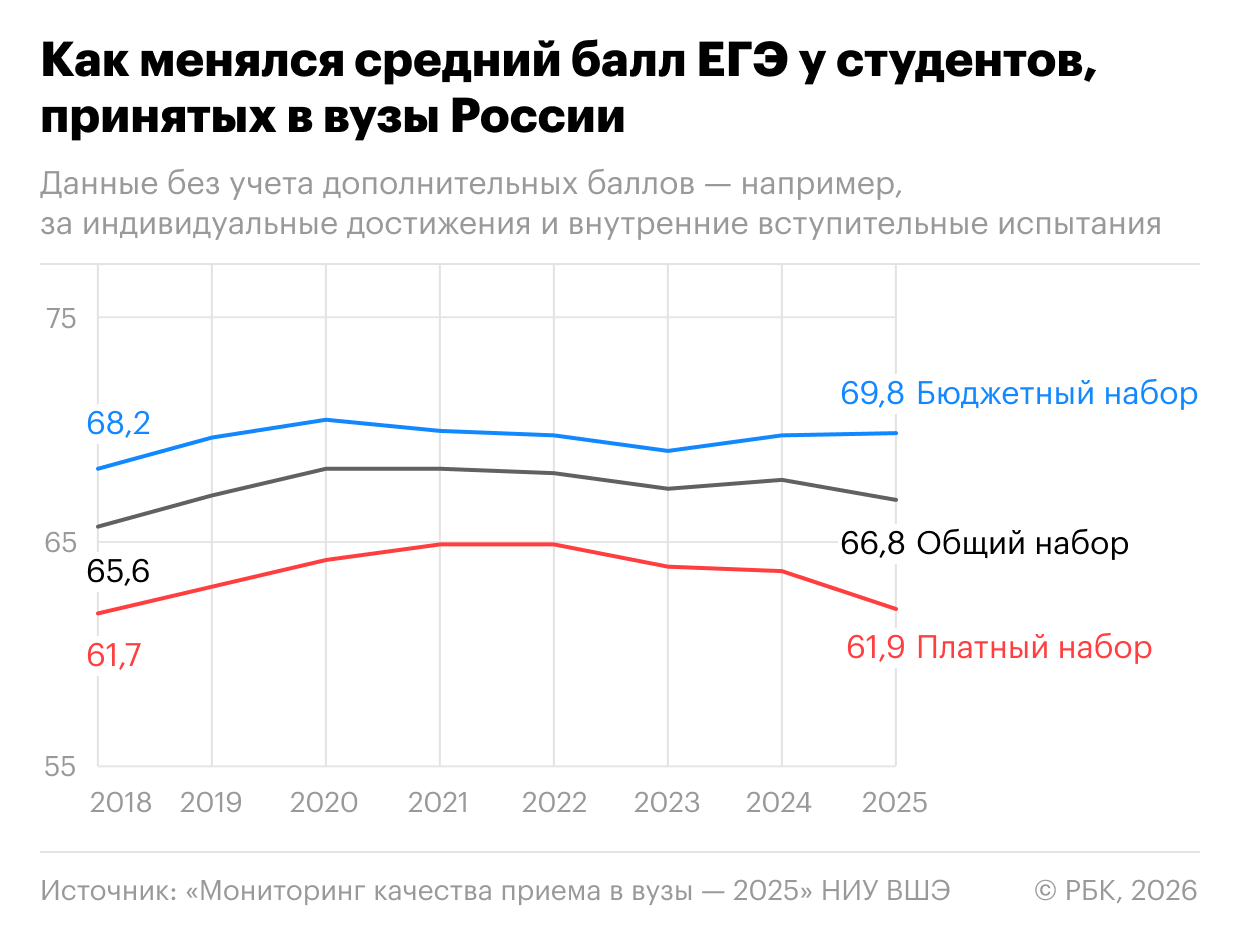 Авторы исследования отмечают, что, если рассматривать показатели платного набора за последние восемь лет, те демонстрируют положительный сдвиг качества, а снижение в последние годы стоит интерпретировать скорее «как фазу адаптации к изменяющимся условиям рынка образования, чем как долгосрочную деградацию качества».