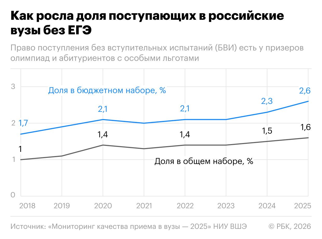 Данные ВШЭ подтверждают тренд на увеличение числа студентов, которые поступают без вступительных испытаний, то есть без предоставления результатов ЕГЭ. Такое право получают призеры и победители олимпиад, а также льготные категории абитуриентов.