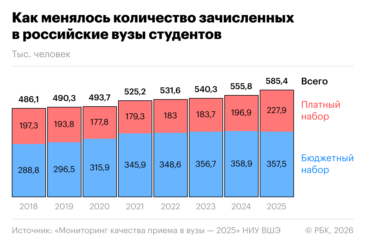 Всего за год число принятых студентов увеличилось с 555,8 тыс. до 585,4 тыс. Это произошло за счет прироста числа платных студентов, в то время как количество поступивших на бюджет осталось почти таким же. В целом за три года, с 2023-го по 2025-й, число принятых в вузы на платной основе увеличилось на четверть, а на бюджет — на 0,2%.