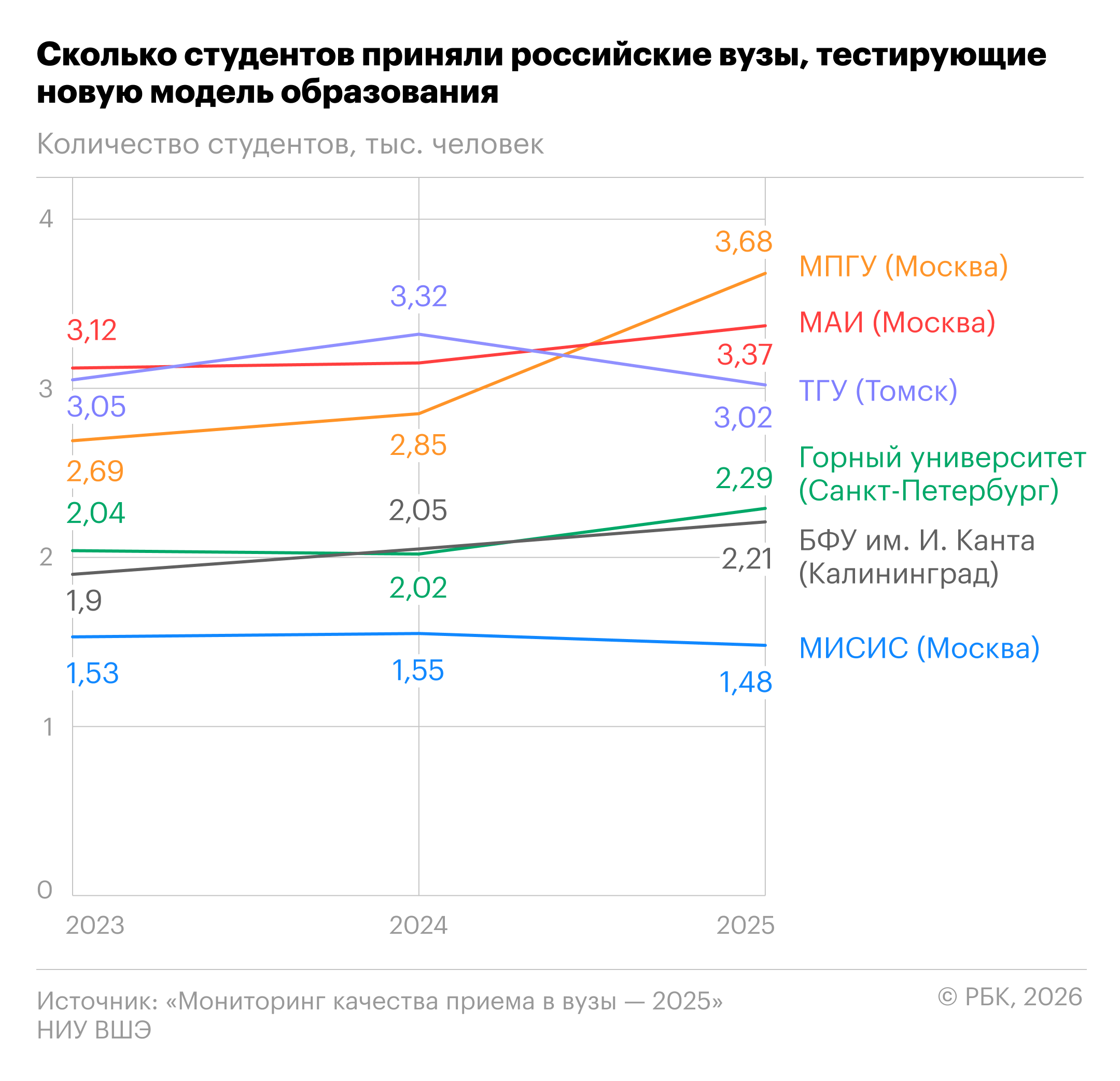 Университеты, которые начали переход на новую модель высшего образования, с 2023 года показывают разные результаты. Например, в Томском государственном университете (ТГУ) и Московском педагогическом государственном университете (МГПУ) средний балл ЕГЭ поступивших стабильно снижался в течение трех лет, с 74,1 до 70,4 балла и с 72,1 до 67 баллов соответственно. В то же время в МПГУ количество студентов в это время увеличилось на 37,1%, что считается рекордным среди пилотных вузов. В ТГУ же число принятых студентов осталось примерно на том же уровне, в 2025 году туда поступили 3 тыс. человек.