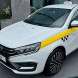Это автомобиль Lada Aura белого цвета с желтой линией по периметру кузова и черными шашечками